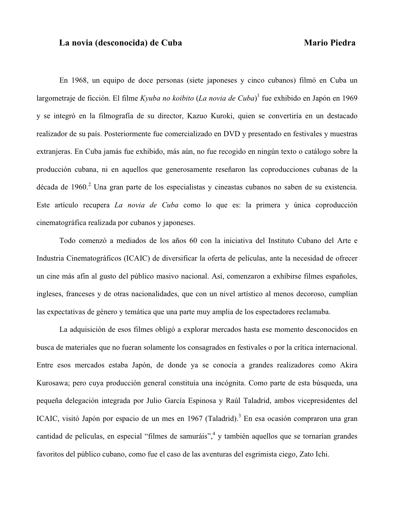 Mario Piedra es profesor de cine y coordinador del Comité Asesor del Grupo de Estudios Japoneses, en la Facultad de Artes y Letras de la Universidad de La Habana. El Grupo se constituyó como un proyecto académico para apoyar y promover el estudio de la cultura japonesa en/desde Cuba. Su investigación sobre el filme La novia de Cuba formó parte del documental de Marian García Alán, La novia de Akira, el cual recibió el apoyo de la Fundación Japón.