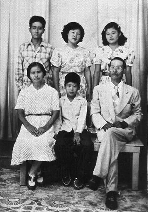 "Kamaichi y Kame con sus hijos nacidos en Cuba, 1953. De izquierda a derecha: Manuel Miyuki, María Mitsuye, Benita Eiko y Julio Shigeru al centro".