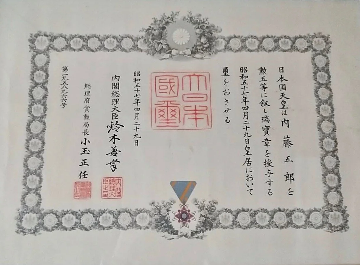 Diploma de La Orden del Sagrado Tesoro de Goro Naito, 1982. Foto cortesía de su hijo, Mario Naito.