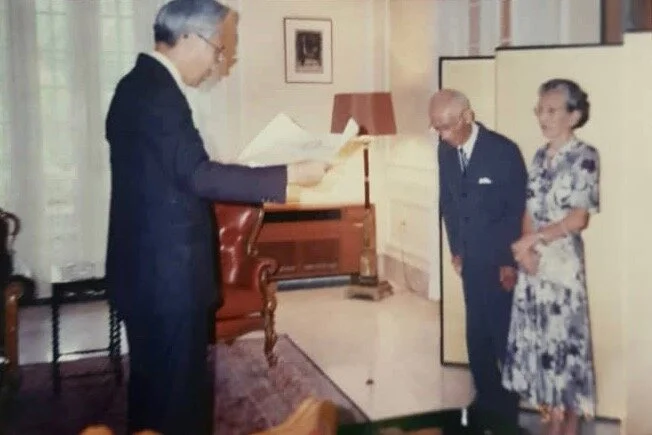 Kanji Miyasaka y su esposa, Kesano Machida. Ceremonia para la condecoración de La Orden del Sol Naciente, Residencia del Embajador de Japón en Cuba, 1994. Archivo familiar.