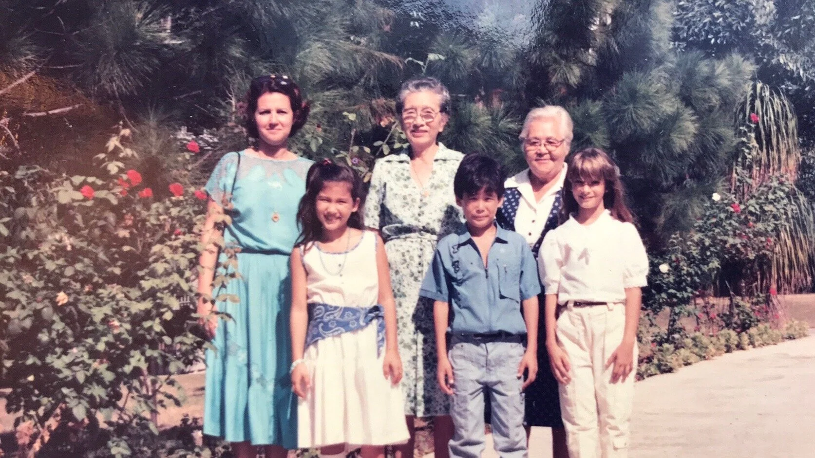 De izquierda a derecha, mi madre, Louciana Chirino, yo (Miharu Miyasaka), mi abuela, Kesano Machida, mi hermano, Kyoharu Miyasaka, y dos personas cuyos nombres no recuerdo. Residencia del Embajador, circa 1989.